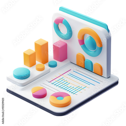 3D analytics dashboard with chart and pie graph on book representing business report data visualization strategy finance marketing or office summary