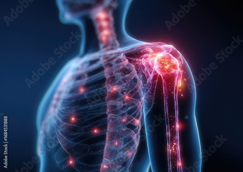 anatomy, shoulder, joint, pain, skeleton, bone, muscle, human, three-dimensional, medicals, illustration, painful, inflammation, x-ray, digital, graphic, red, glowing, light, highlight, injury, treatment, diagnostic, body, scapula, upper arm, ligament, tendon, tissue, anatomical, display, health