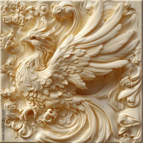 3D bas-relief of a Phoenix bird in vanilla and beige tones. Resource, sketch for creativity, template for greeting card, invitation, fantasy print, Creative interior decor, decor of exhibition pavilio