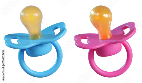 3D Blue baby and Pink Pacifier icons. Silicone nipple. Newborn boy and girl accessory in soft pastel colors isolated on a transparent background. 3D render