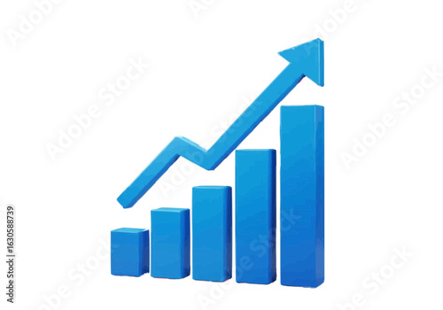 3D blue bar chart with a rising arrow symbolizing business growth, financial success, and market progress on a white background.