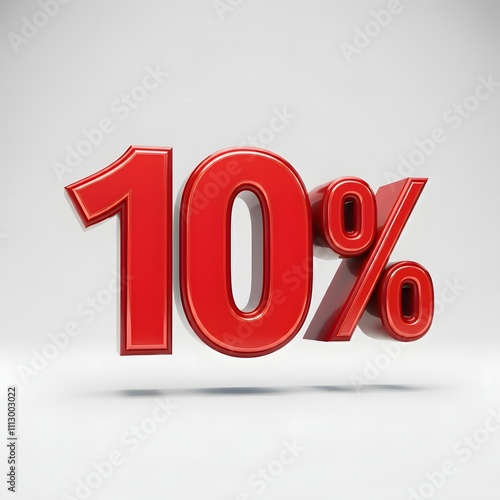 3D bold red text reading '10%' with a glossy finish and floating shadow effect, highlighted by rim lighting. Presented on a pure white background, offering a sleek and professional promotional design