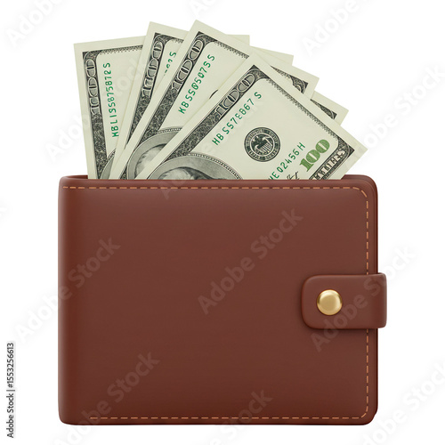 3D Brown Leather Wallet with US Dollar Bills Money Isolated