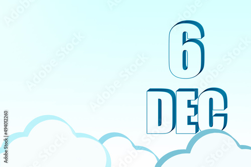 3d calendar with the date of 6 December on blue sky with clouds, copy space. 3D text. Illustration. Minimalism.