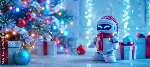 three-dimensional, cartoon, cute, santa, ai, robot, futuristic, room, blue, led, light, new, year, ornament, christmas, tree, gift, box, copy space, snow, winter, holiday, christmas, snowman, decoration, celebration, illustration, present, claus, snowflake, new year, happy, vector, card, star, season, december, 2025, 2026, ornament, ball, ice, seasonal, fir, android, technology, science, toy, fun