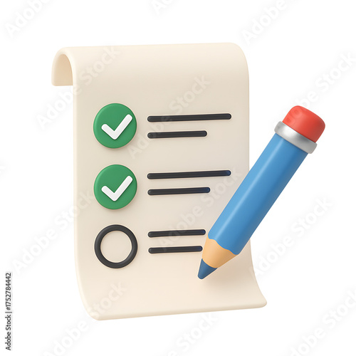 3D checklist icon, paper with pencil and green check marks, isolated on transparent background