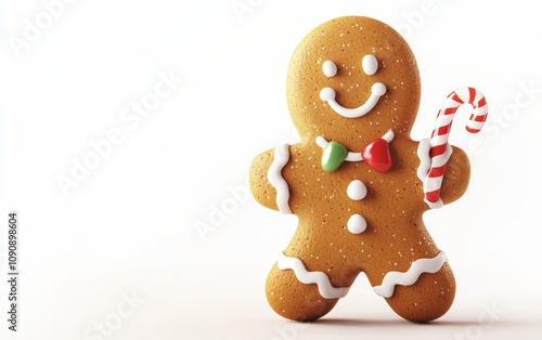 3D Christmas gingerbread man character with icing decorations, smiling warmly and holding a small candy cane, vibrant colors on a white background