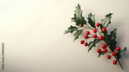 3D Christmas Holly Branch with Minimalist Background, vibrant green leaves adorned with red berries, ideal for festive greetings or holiday message placement below.