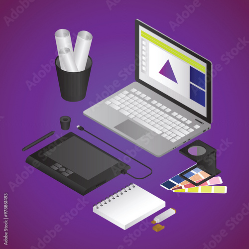 three-dimensional, background, blue, business, copy, designing, device, diary, digital, drawing paper, electronic, element, graphic, instrument, isometric, laptop, marker, notebook, object, realistic, render, technology, tool, web, workplace, workstation