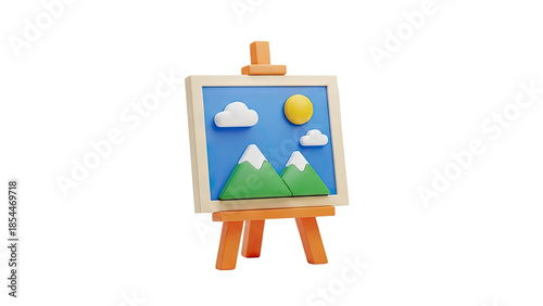 easel, painting, canvas, mountain landscape, drawing, creative, nature scene, mountain, sun, cloud, studio, childlike, simple, landscape, sky, summer, sunny, daylight, scenic, visual, representation, display, frame, blue skies, white cloud, cute, modern, stylised, concept, hobby, art, illustration, artistic, cartoonish, icon, graphical, digital artwork, design, isolated, artwork, art supply