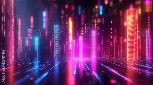 3D glowing bar graph with vibrant neon colors and shadows, set against a sleek digital background