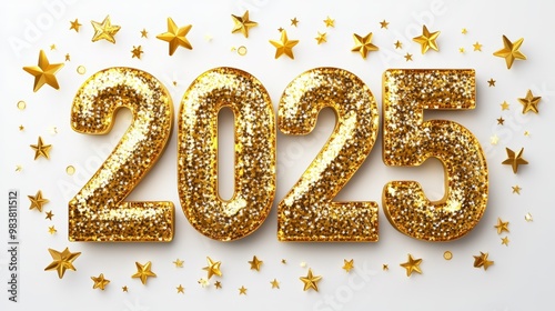 3D golden text "2025" with glitter and stars on a white background. Golden New Year celebration elements around the numbers, shiny metallic effect, isolated on white backgrounds.