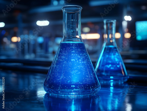 3D Illustration, Laboratory Beakers with Blue Solution, Science Experiment