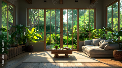 3D Illustration of a Living Room with a Window Viewing a Lush Green Garden