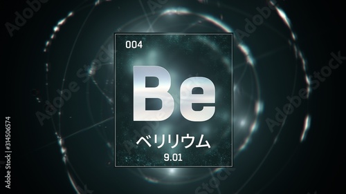 3D illustration of Beryllium as Element 4 of the Periodic Table. Green illuminated atom design background orbiting electrons name, atomic weight element number in Japanese language