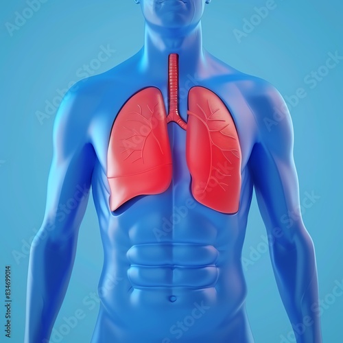 3D illustration of human lungs highlighted in red, showing internal respiratory anatomy on a blue background for medical and educational purposes.
