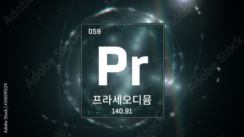 3D illustration of Praseodymium as Element 59 of the Periodic Table. Green illuminated atom design background orbiting electrons name, atomic weight element number in Korean language