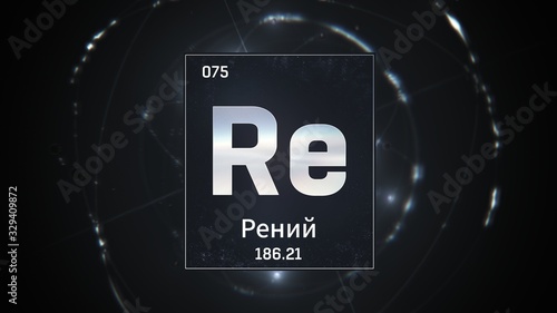 3D illustration of Rhenium as Element 75 of the Periodic Table. Silver illuminated atom design background with orbiting electrons name atomic weight element number in russian language