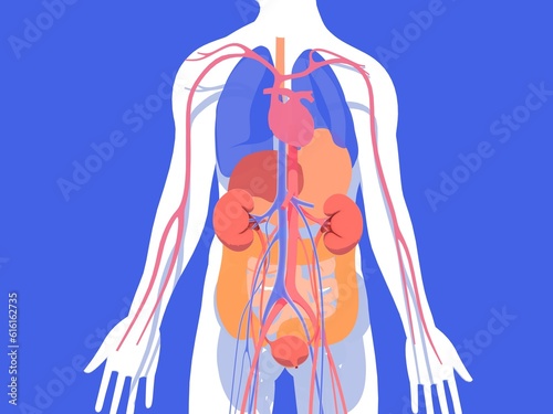 3d illustration of the internal organs of the human anatomy, highlighting the kidneys in relief. Transparent image with flat colors on a blue background.