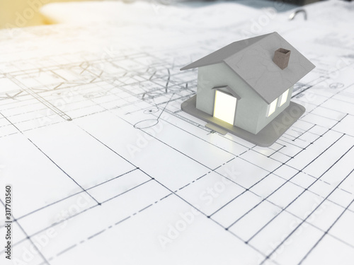 3d illustration rendering of simple house and glow light, blank house plan background.