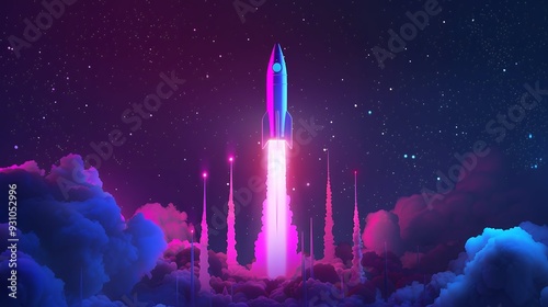 3d illustration rocket space colorful holographic in dark background for Business start up and science concept