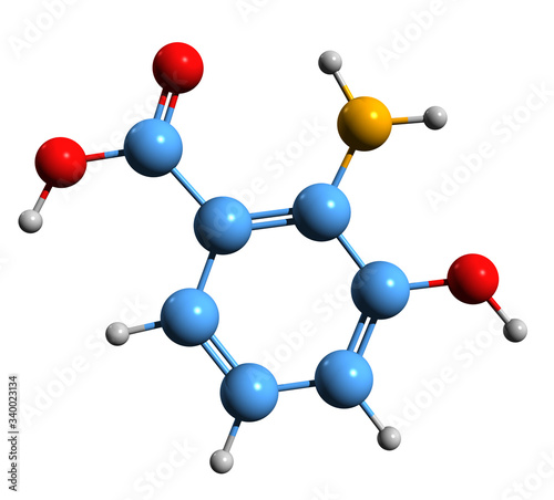 3D image of 3-Hydroxyanthranilic acid skeletal formula - molecular chemical structure of 2-Amino-3-hydroxybenzoic acid isolated on white background