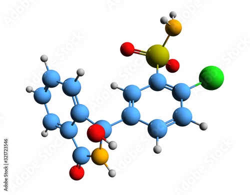 3D image of chlortalidone skeletal formula - molecular chemical structure of diuretic drug chlorthalidone isolated on white background