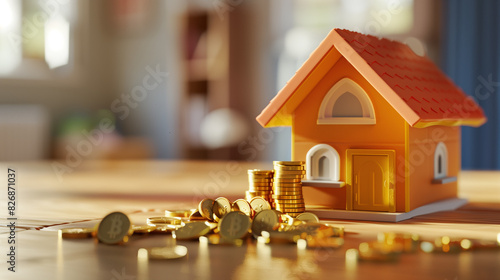 3d model of home with some gold coins on the table, savings for purchasing new house or real estate investment concept