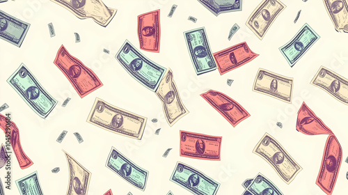 3D Money Rain Tile Pattern Overhead View Seamless Cartoon Bills Falling Abundance Financial Success Minimalist Style Various Denominations Unique Design Iconic Illustration