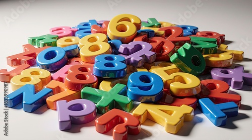 3d plastic numbers scattered randomly, with glossy textures and bright primary and secondary colors, are chunky, smooth, and toy-like, overlapping each other with playful randomness.
