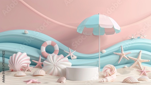 3D render, abstract background with summer elements and an empty white podium for product presentation.