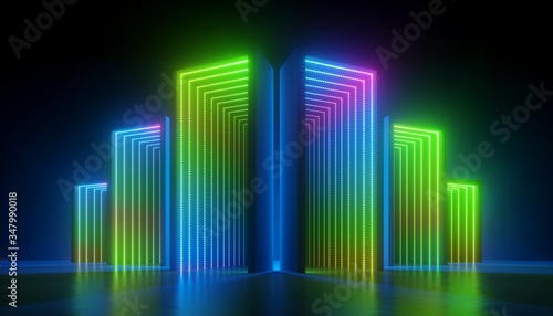 3d render, abstract colorful neon background, empty boxes with green blue pink light illumination inside.