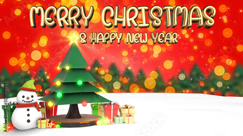 3D Render Background images of the Christmas and Happy New Year concept. There are Snowman, Christmas trees, gift boxes, and shining toys. On a beautiful red background.