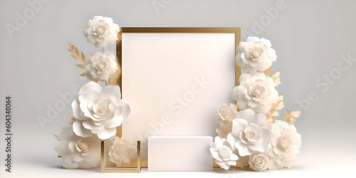 3d render, empty stage with square frame decorated with gold and white paper flowers, isolated on white background. Showcase with blank podium and floral arrangement, Generative AI