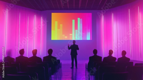 render, businessman, giving, presentation, conference, room, floating, chart, graph, market, trend, financial, forecast, illustration