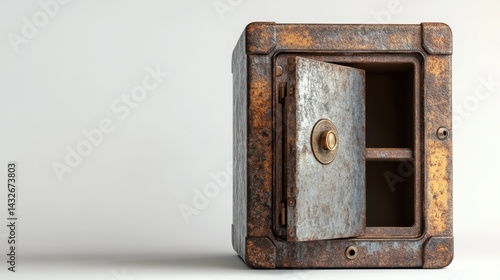 3D render of a metal safe with the door slightly ajar, revealing an empty interior, white background