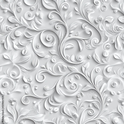 3D render of a seamless pattern with white plasticine, featuring floral leaves and swirls, vector illustration on a light grey background, seamless wallpaper design.