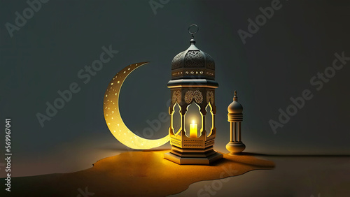 3D Render of Illuminated Arabic Lamp With Crescent Moon On Sand Dune. Islamic Religious Concept.