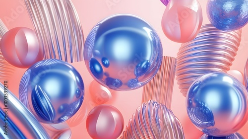 3d render realistic primitives composition. Flying shapes in motion isolated on pink background. Abstract theme for trendy designs. Spheres, torus, tubes, cones in metallic blue and pink colors.