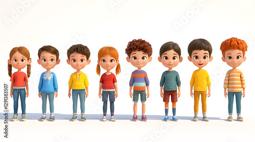 3D rendered cartoon children, various ages (toddlers to teenagers), neatly aligned in a row, facing the camera, plain white background, detailed clothing, expressive eyes, soft lighting, bright