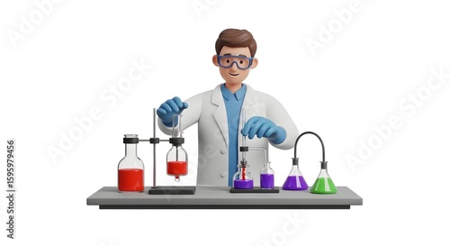 3D rendered Cartoon scientist in a lab coat conducts an experiment with colorful liquids in beakers and flasks.