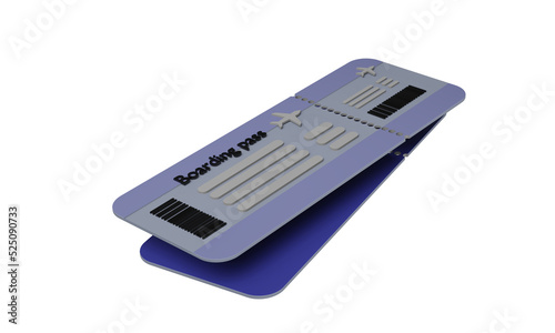 3D rendering illustration. Airline ticket, boarding pass in flat style isolated on white background. Travel, booking, traveling on airplane, planning a vacation and tourism advertising concept.