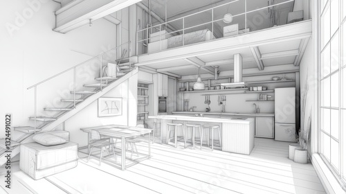 interior design, modern, kitchen, residence, home decoration, drawing, realistic, wireframe, digital artwork, illustration, architecture, contemporary, stylish, comfortable, roomy, trendy, luxury, indoor, room, art, visualisation, cosy, minimalist, elegant, creative, unique, urban, chic, high technology, futuristic, aesthetic