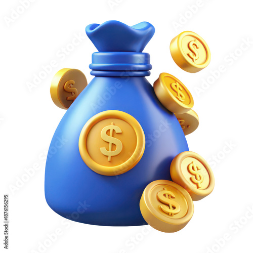 3d rendering of a blue money bag with dollar sign and flying coins isolated on a transparent background