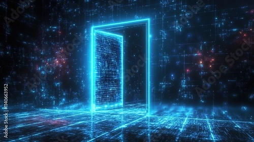 3D rendering of a futuristic digital door with glowing light in a dark room background.