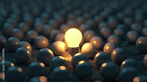 3D rendering of a single glowing light bulb among many dark, closed bulbs in a dim area, with ample space for creative text