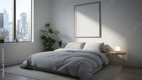 bedchamber, minimalism, white, grey, modern, bed, plant, plant, linen, floor, wooden, window, city view, home interior, decoration, interior, home decor, apartment, bedding, comfortable, home, lifestyle, furniture, contemporary, style, sheet, indoor, concept, background, copy space, art deco, indoor, no people, decor, pillow, nobody, empty, design, architecture, blanket