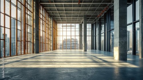 3D rendering of a steel bar frame structure with cement pouring in a high rise building set against an urban industrial construction backdrop