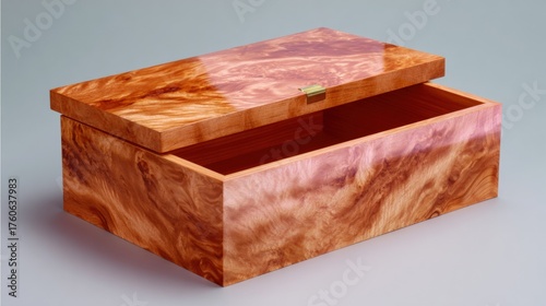 3d rendering of a wooden box with a lid. the box is rectangular in shape and has a smooth surface. the lid is open, revealing the interior of the box.