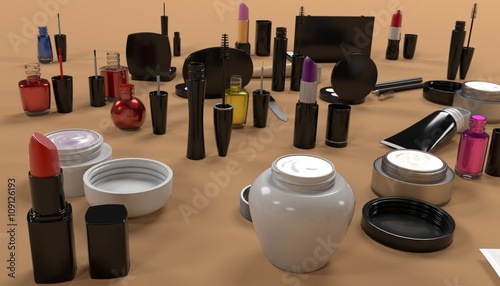 three-dimensional, render, illustration, cosmetic, make-up, beauty, care, fashion, purse, make-up, lady, woman, woman, face, paint, art, box, colours, girl, skin, nail, eye, mascara, lip, set, collection